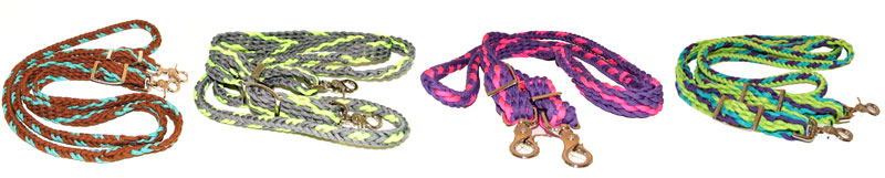 Our favorite braided rein customized just for you. Hand braided, continuous, adjustable 8 ft rein. Great for timed contest, barrel racing, trail ride, or parade. A great all-around riding accessory with so many fun color choices. Flat braid transitions to a round braid for an easy grip. Two scissor snaps at bridle end and two conways, making your rein fully adjustable. Simply choose your colors from our vast color list.